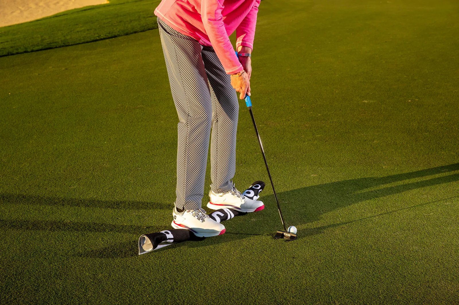 Khi putt, hãy cảm nhận trọng lượng cơ thể nằm giữa bàn chân, không đổ về mũi hay gót chân. Sau khi bỏ khăn ra, bạn sẽ cảm nhận rõ sự vững vàng, từ đó hạn chế chuyển động thừa của phần thân dưới.