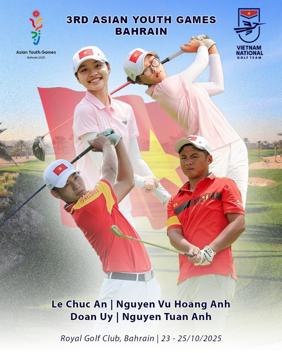 Thành phần đội tuyển gồm Đoàn Uy, Nguyễn Tuấn Anh (nội dung nam) và Lê Chúc An, Nguyễn Vũ Hoàng Anh (nội dung nữ). Các vận động viên sẽ tranh tài ở bốn nội dung thi đấu: cá nhân nam, cá nhân nữ, đồng đội nam và đồng đội nữ. Môn golf tại AYG 2025 sẽ diễn ra từ ngày 23 đến 25/10/2025 trên sân Royal Golf Club, một trong những sân golf tiêu chuẩn hàng đầu tại Bahrain.
