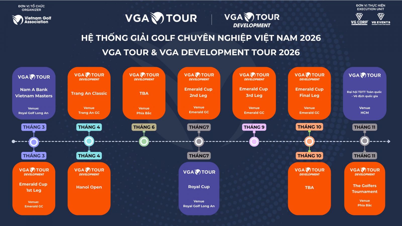 Ở mảng chuyên nghiệp, VGA Tour tiếp tục giữ vai trò chủ đạo với ba giải đấu chủ lực gồm Vietnam Masters, Royal Cup và Giải Vô địch Quốc gia trong khuôn khổ Đại hội Thể dục Thể thao Toàn quốc. Đáng chú ý, Vietnam Masters – giải đấu lâu đời nhất của golf chuyên nghiệp Việt Nam – tiếp tục góp mặt trong hệ thống Asian Development Tour, qua đó duy trì cầu nối quan trọng giữa golfer Việt và sân chơi khu vực.