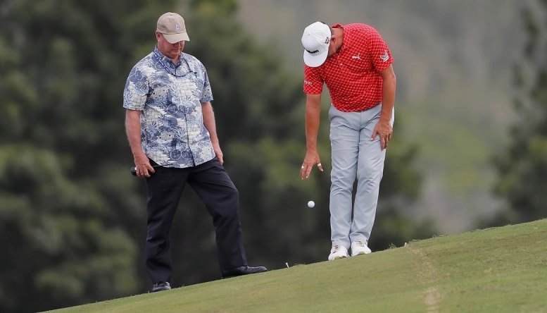 Luật quy định rõ ràng: khi thả bóng, golfer phải đứng thẳng, giữ bóng ngang vai, cánh tay duỗi thẳng và thả xuống.
