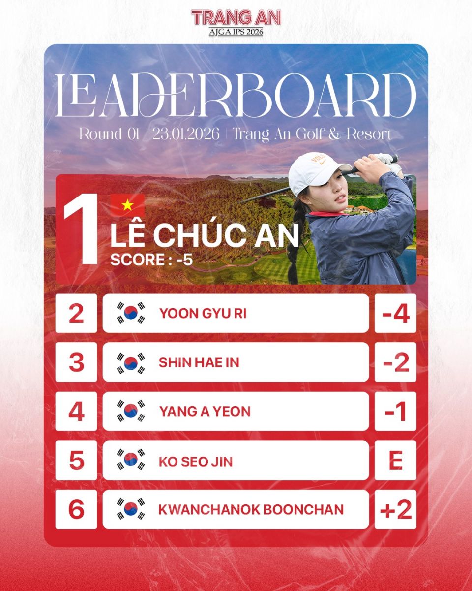 Bước sang nửa sau của vòng đấu, cô tạo nên màn bứt phá ấn tượng khi ghi liền 4 birdie liên tiếp, qua đó kết thúc ngày thi đấu với 67 gậy (-5). Thành tích này giúp Lê Chúc An tạm thời độc chiếm ngôi đầu bảng nữ, hơn 1 gậy so với golfer Hàn Quốc Yoon Gyu Ri. Một đại diện khác của Việt Nam là Nguyễn Khánh Linh đạt 76 gậy (+4), tạm xếp đồng hạng 8.