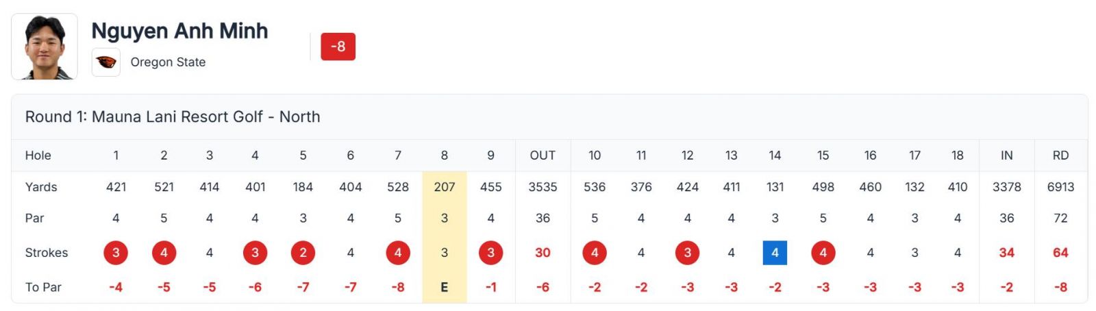 Một trong những khoảnh khắc đáng chú ý nhất của vòng đấu đến ở hố 5 par 3 dài 184 yards. Tại đây, Anh Minh ghi birdie gọn gàng chỉ sau hai gậy, nối dài chuỗi điểm âm và đưa bảng điểm cá nhân xuống mức rất sâu so với par. Duy trì sự điềm tĩnh và chiến thuật hợp lý, golfer của Oregon State tận dụng tốt các cơ hội ghi điểm trên mặt sân tương đối “mở” tại Hawaii.