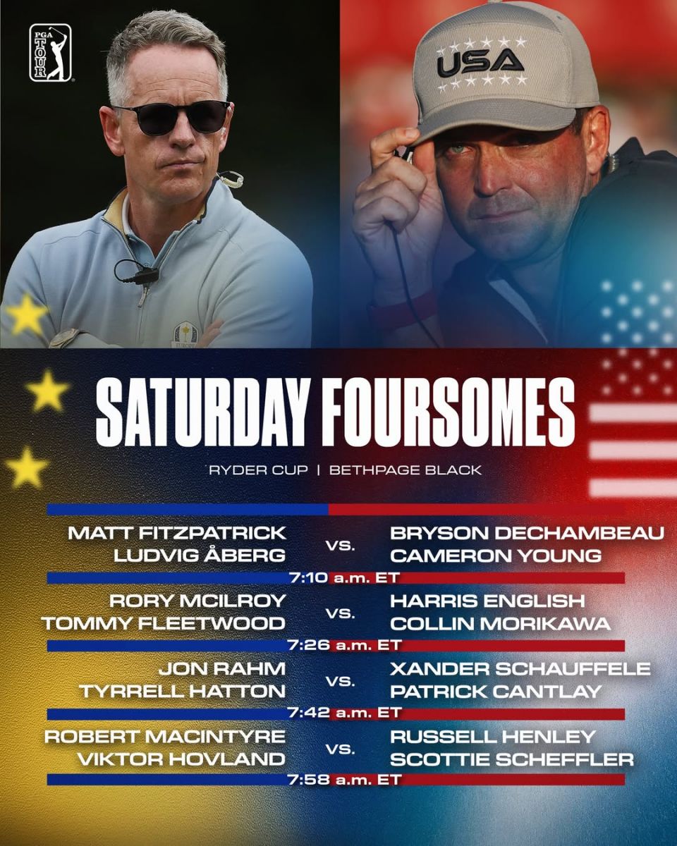 Sau ngày thi đấu mở màn, tuyển châu Âu vươn lên dẫn trước Mỹ 5,5 – 2,5, tái hiện kịch bản gây áp lực lớn cho đội chủ nhà Bethpage Black. Sáng thứ Bảy, bốn trận Foursomes tiếp tục hứa hẹn nhiều căng thẳng.
