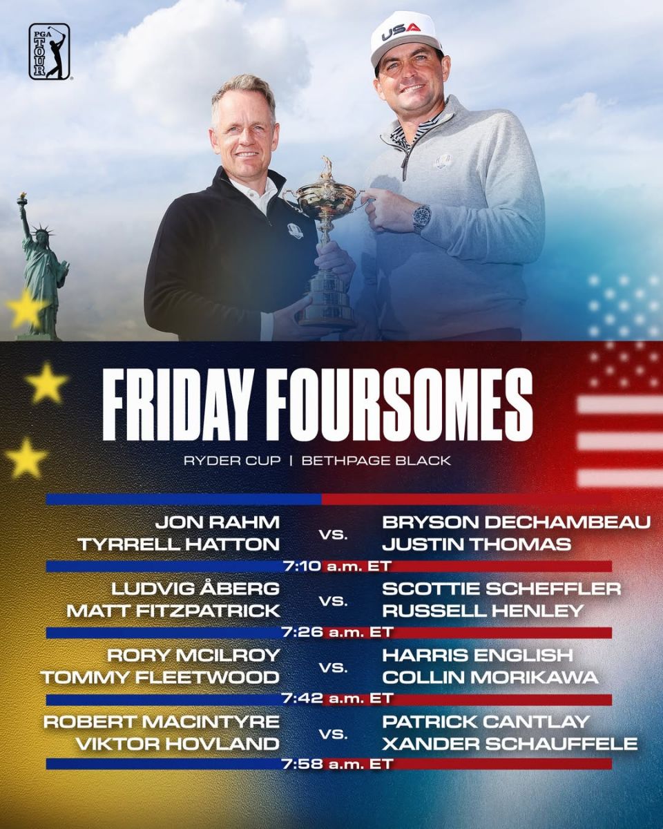Trong buổi trò chuyện trên Golf Channel, hai đội trưởng Keegan Bradley (Mỹ) và Luke Donald (châu Âu) đã tiết lộ lựa chọn của mình. Tâm điểm mở màn sẽ là màn so tài giữa Bryson DeChambeau – Justin Thomas và cặp đôi châu Âu Jon Rahm – Tyrrell Hatton.