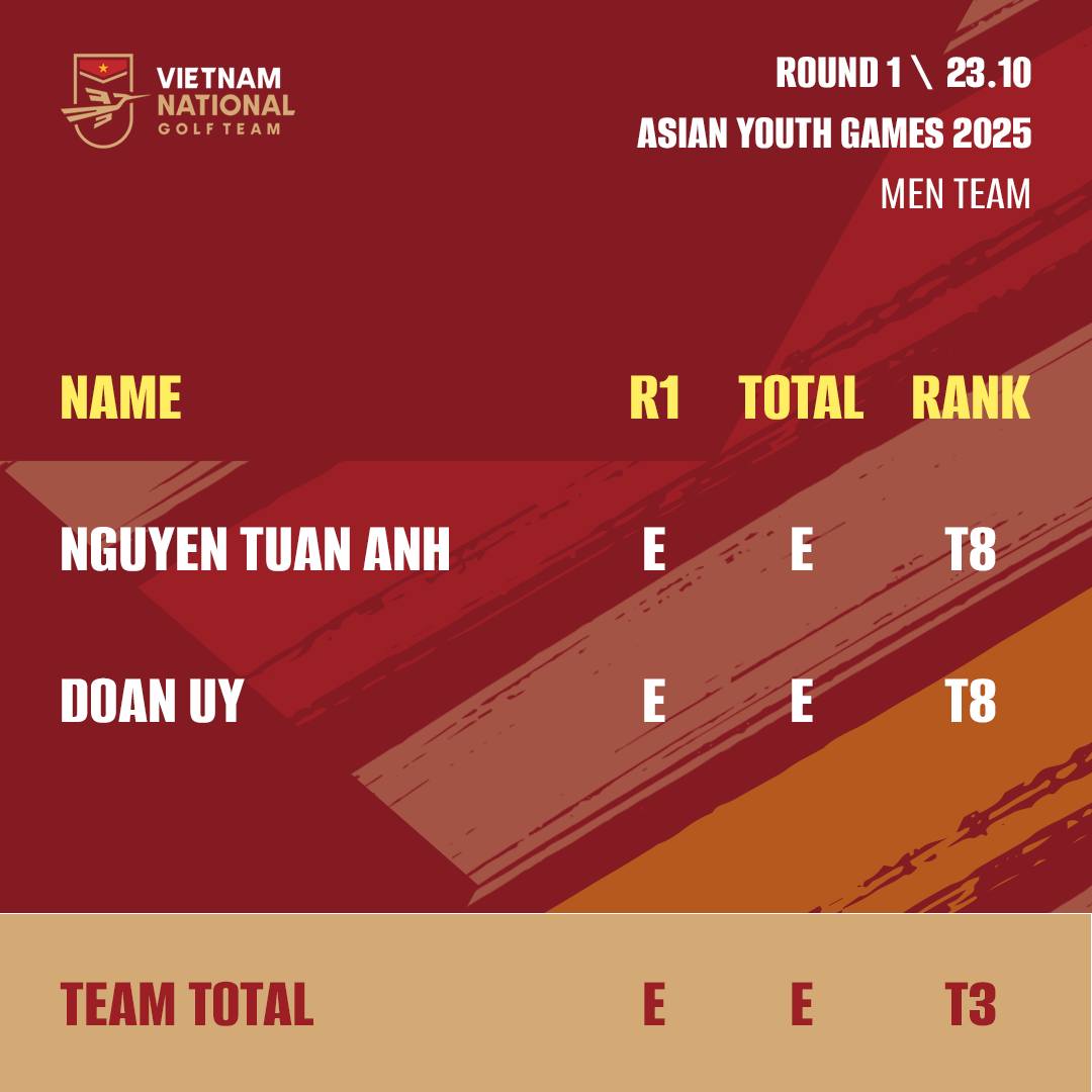 Ở nội dung nam, hai golfer trẻ Nguyễn Tuấn Anh và Đoàn Uy cùng khép lại vòng 1 với 72 gậy (even par) – một kết quả ổn định giúp đội tuyển nam Việt Nam đang tạm xếp hạng 3 đồng đội, sẵn sàng cho cuộc cạnh tranh huy chương trong những ngày tới.