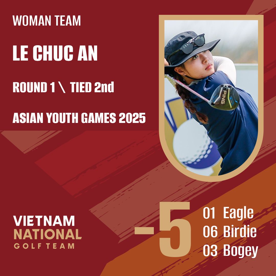 Ở nội dung nữ, cái tên Lê Chúc An thực sự tỏa sáng. Golfer 17 tuổi chơi thăng hoa khi ghi 67 gậy (-5), trong đó có 1 eagle và 6 birdie cực kỳ ấn tượng. Với phong độ ấy, Chúc An đang tạm xếp hạng T2, chỉ kém đúng 2 gậy so với vị trí dẫn đầu – một khởi đầu không thể tốt hơn cho đại diện Việt Nam.